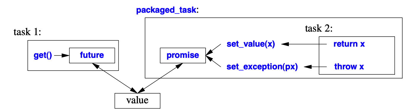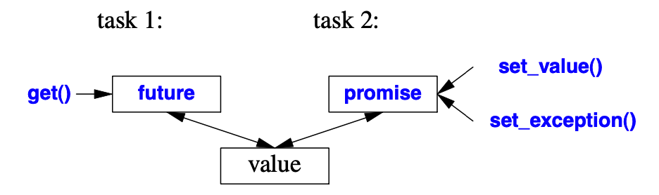 本质上,要完成任务间的通信,需要在新线程创建的时候让线程库给我们添加一个共享的状态,主线程和新线程通过这个共享状态的句柄进行通信。主线程下,这个句柄就是future,新线程下,这个句柄就是promise